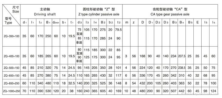 ZQ1000+250大速比齒輪減速機(jī)重約為2189kg,高速軸直徑為70,出軸長度為110,主軸直徑為160,出軸型式有:圓柱形被動(dòng)軸端,CA齒輪形被動(dòng)軸端。有九種裝配型式。