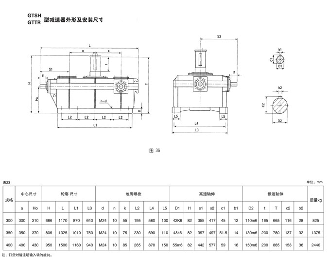 GTTR三環減速機為組合二級傳動,為鋼包回轉臺用,具有兩根垂直于平面的高速軸,箱體平置,裝端面剖分,此減速機中心距范圍300-400mm,速比77.9-503.3,輸出轉矩范圍10.52-24.67kN.m。